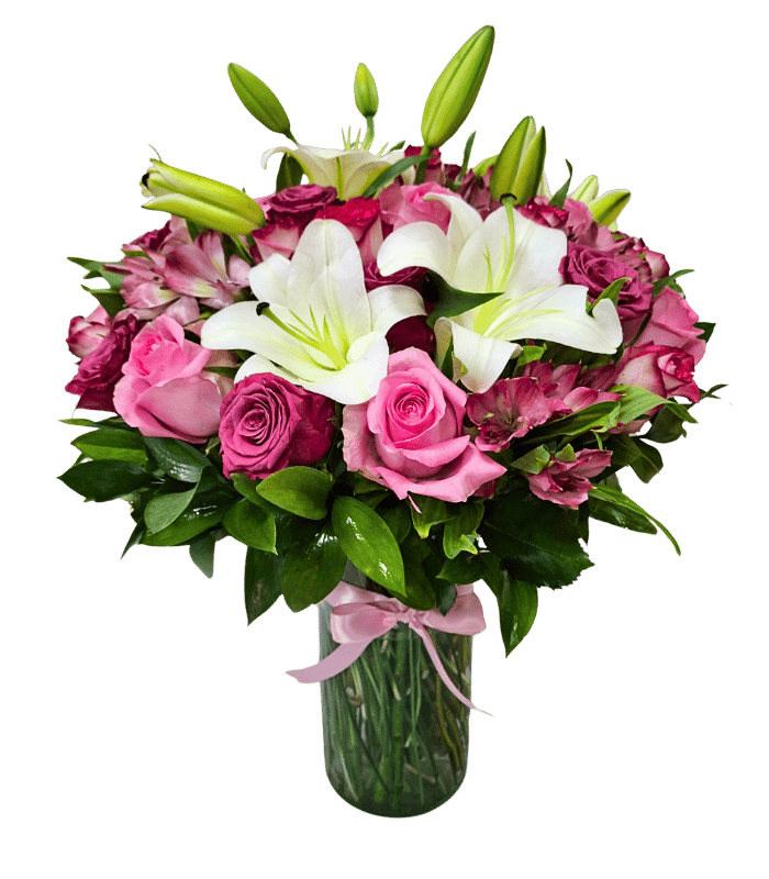 A premium flower arrangement of 20 imported roses, 7 alstroemerias, and 3 lilies, arranged in a glass vase with greenery.