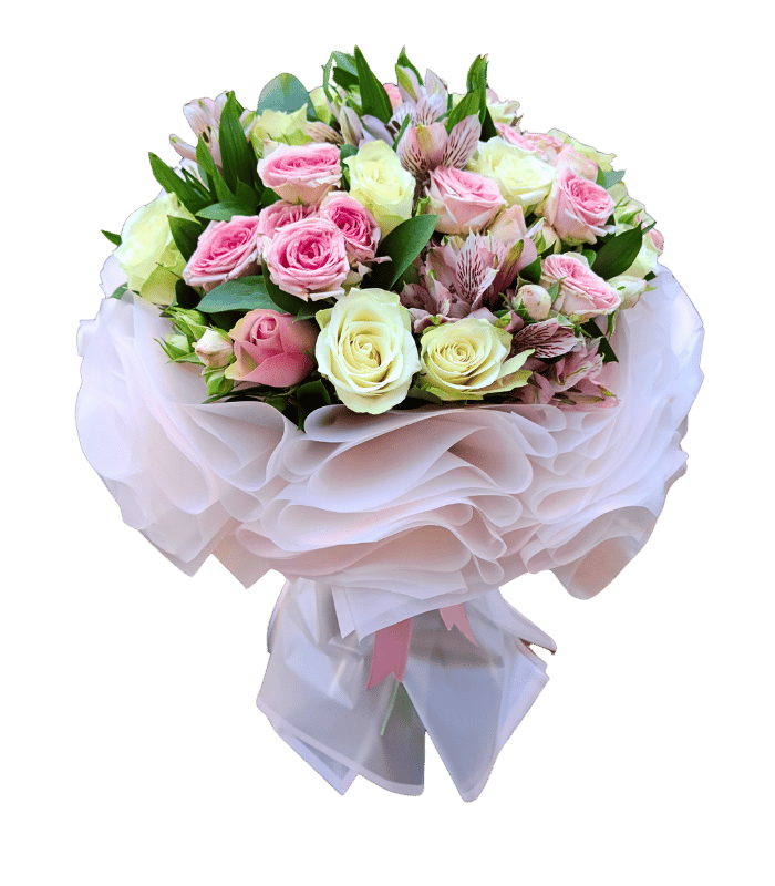 An elegant flower arrangement of 25 roses and 10 alstroemerias, wrapped in a lovely hand bouquet with greenery.