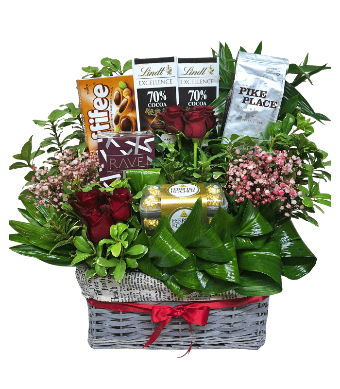 A premium gift basket of 6 roses with baby flowers and greenery with a premium selection of chocolates, coffee and perfume.