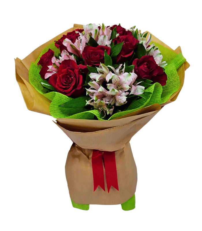 An elegant flower arrangement of 9 roses and 5 alstroemerias, wrapped in a lovely hand bouquet with greenery.
